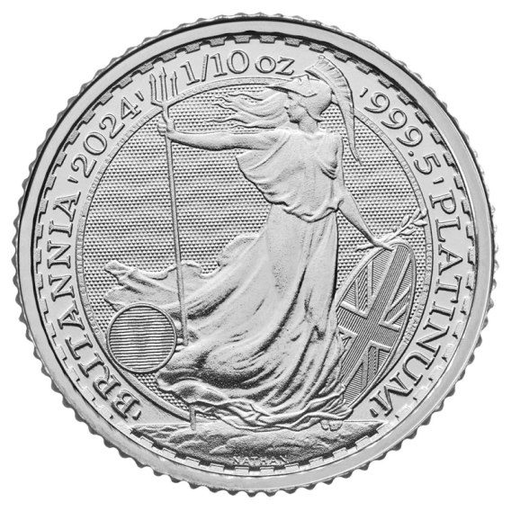 1/10 oz platynowa moneta Britannia 2024 z wizerunkiem Karola III. Próba 999.5, producent The Royal Mint. Oficjalny środek płatniczy – idealna inwestycja w platynę.