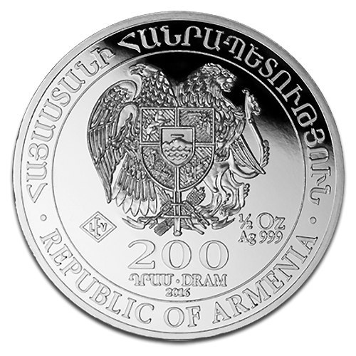 1/2 oz Arka Noego 2016 to srebrna moneta bulionowa z Armenii, wykonana ze srebra próby 999/1000. Na rewersie przedstawia Arkę Noego i górę Ararat, dostarczana w kapslu ochronnym – ceniona przez inwestorów i kolekcjonerów.