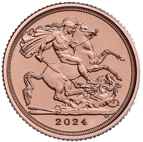 Na rewersie widnieje klasyczna scena walki Świętego Jerzego ze smokiem, autorstwa Benedetta Pistrucciego. To ponadczasowy motyw obecny na Suwerenach od XIX wieku, będący symbolem triumfu dobra nad złem. U dołu monety wybito rok emisji – 2024.