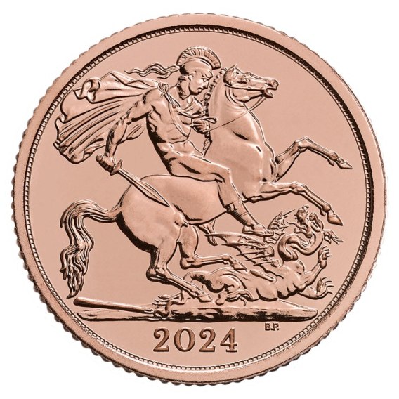 Pół Suwerena Karol III 2024 – złota moneta The Royal Mint, wybita z 3,99 g złota próby 916,7. Klasyczny motyw św. Jerzego i portret Karola III. Idealna inwestycja i element kolekcjonerski.