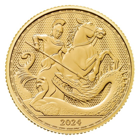 Rewers zdobi dynamiczna scena z legendy o Świętym Jerzym walczącym ze smokiem – symbol odwagi, siły i triumfu dobra nad złem. Motyw ten jest głęboko zakorzeniony w angielskiej tradycji i od wieków stanowi inspirację dla sztuki menniczej. Wzór uzupełniają oznaczenia wagi, próby złota i rok emisji 2024.