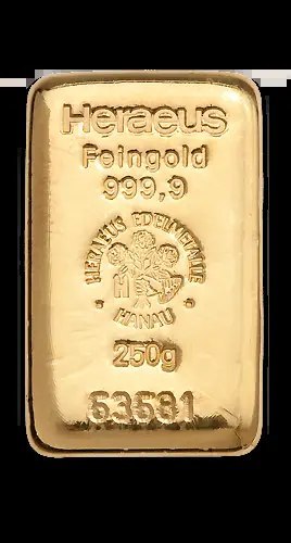 250g Złota Sztabka | Heraeus – ręcznie odlewana doskonałość w niemieckim wydaniu
